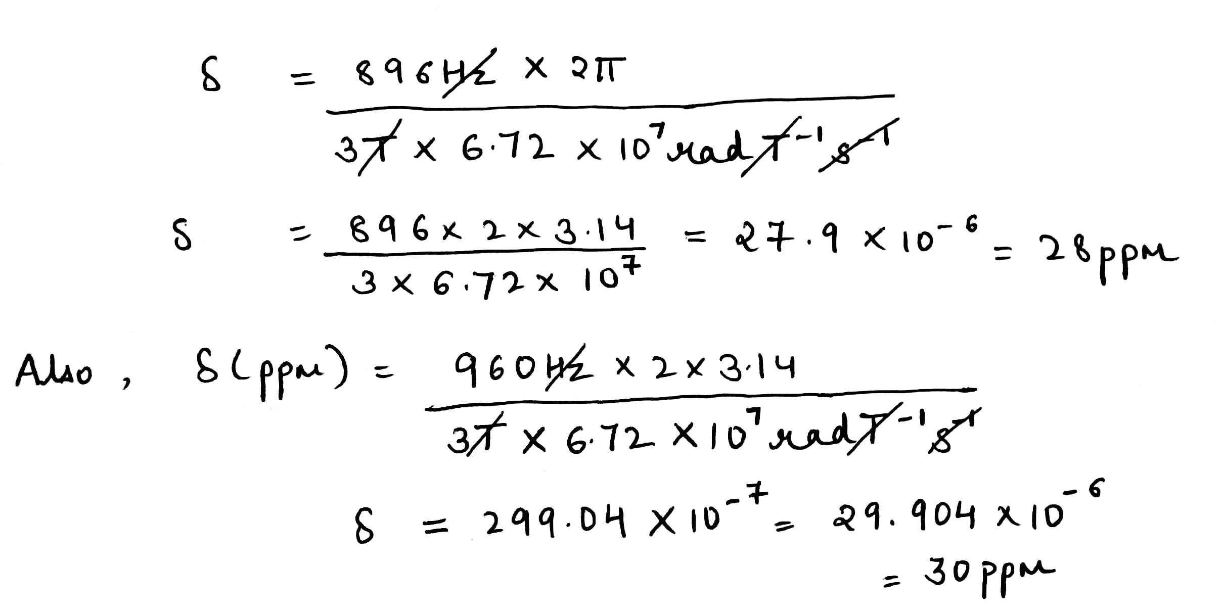 The shift from TMS for a given proton depends on the strength of the applied magnetic field. In an applied field of 1.41 Tesla the resonance of a proton is approximately 60 MHz, whereas in an applied field of 2.35 Tesla (23,500 Gauss) the resonance appears at approximately 100MHz.The ratio of the resonance frequencies is the same as the ratio of the two field strengths: