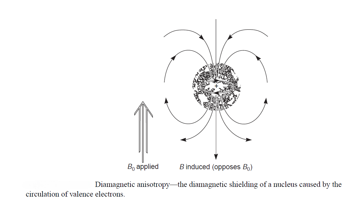 Nuclear magnetic resonance has great utility because not all protons in a molecule have resonance at exactly the same frequency. This variability is due to the fact that the protons in a molecule are surrounded by electrons and exist in slightly different electronic (magnetic) environments from one another. The valence-shell electron densities vary from one proton to another. The protons are shielded by the electrons that surround them. In an applied magnetic field, the valence electrons of the protons are caused to circulate. This circulation, called a local diamagnetic current, generates a counter magnetic field that opposes the applied magnetic field. Figure illustrates this effect, which is called diamagnetic shielding or diamagnetic anisotropy.