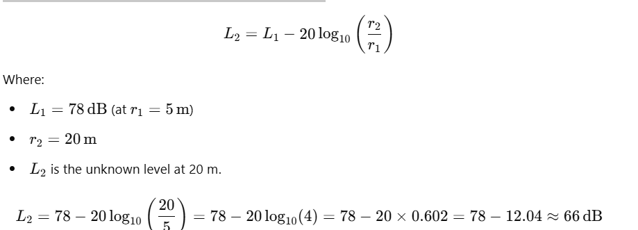 · 69 dB, 72 dB, and 75 dB are incorrect because they reflect smaller reductions than the actual fall-off over a 4x increase in distance.