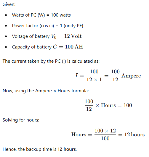 A PC consuming 100 Watts is to be operated on a UPS. The UPS uses a 12 Volts, 100 AH battery. Assuming unity PF, what is the backup time of this unit?
