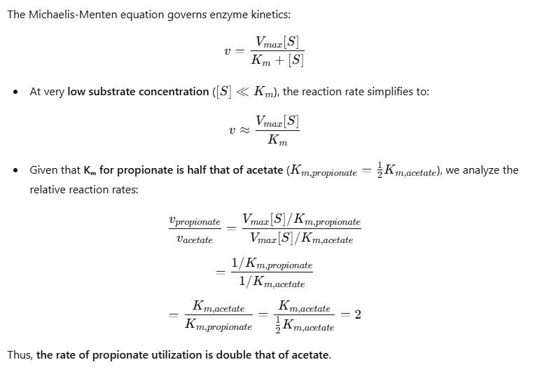- If KmK_mKm of propionate is half that of acetate, its reaction rate will be doubled at very low concentrations.