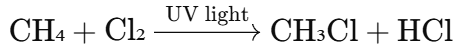 In the reaction between methane (CH₄) and chlorine (Cl₂) under the influence of light:
