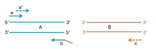 Primer “b”: This primer is used in conjunction with primer “a” and is designed to bind to a complementary sequence in DNA “A”.