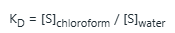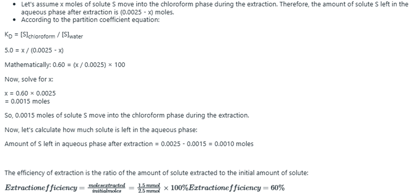 In this case, the solute S has a partition coefficient (KD) of five between water and chloroform. This means that at equilibrium, for every one unit of the solute in the aqueous phase, there will be five units of the solute in the chloroform phase.