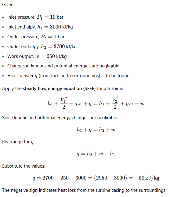 A steam turbine receives steam steadily at 10 bar with an enthalpy of 3000 kJ/kg and discharges at 1 bar with an enthalpy of 2700 kJ/kg. The work output is 250 kJ/kg. The changes in kinetic and potential energies are negligible The heat transfer from the turbine casing to the surroundings is equal to