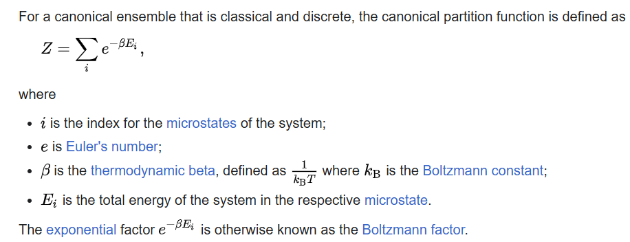 A partition function describes the statistical properties of a system in thermodynamic equilibrium. Partition functions are functions of the thermodynamic state variables, such as the temperature and volume. Most of the aggregate thermodynamic variables of the system, such as the total energy, free energy, entropy, and pressure, can be expressed in terms of the partition function or its derivatives. The partition function is dimensionless. The canonical partition function applies to a canonical ensemble, in which the system is allowed to exchange heat with the environment at fixed temperature, volume, and number of particles. The grand canonical partition function applies to a grand canonical ensemble, in which the system can exchange both heat and particles with the environment, at fixed temperature, volume, and chemical potential.