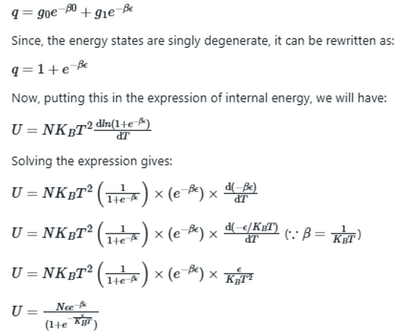 According to the question, the given indistinguishable particles have only two possible energy states 0 and ε. Thus, the partition function will be the sum of distribution of particles in given two energy states and thus q can be written as: