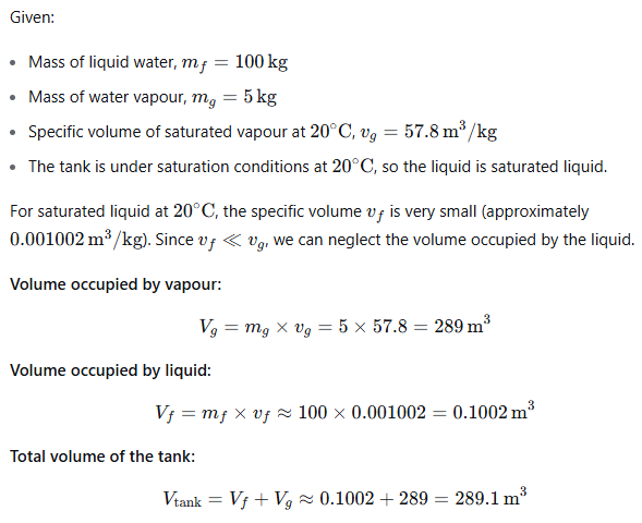 A tank contains 100 kg of liquid water and 5 kg of water vapour under saturation conditions at 20°C. If the specific volume of saturated vapour at that temperature is 57.8 m³/kg, what is the approximate volume of the tank?