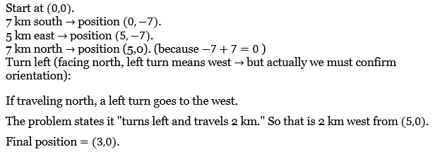 A taxi travels 7 km south, then turns towards the east and travels 5 km, then turns towards the north and travels 7 km and then turns to its left and
