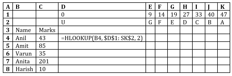 The HLOOKUP function searches for the value in B4 (in this case, 43) in the first row of the range $D$1:$K$2 and returns the corresponding value from the second row. Since the formula is copied down, the marks in each row (e.g., B5, B6) will be searched in the first row of the range, and the matching second-row value will be returned.