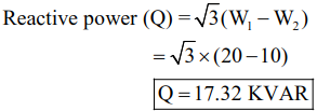A three–phase 500 V motor load has a power factor of 0.4. Two wattmeters connected to measure the input read 20 kW and 10 kW. Find the reactive power