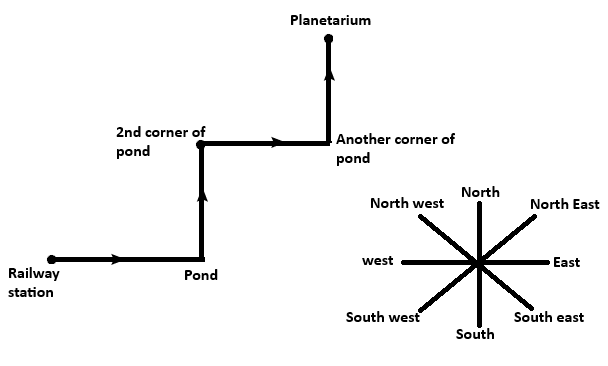 A tourist wanted to see the planetarium in a city. He walked from the railway station in the east direction and arrived at a pond. He turned left and then at the second corner of the pond, he turned right. Soon he reached another corner of the pond. He turned left and arrived at the planetarium. In what direction was the railway station situated with respect to the planetarium?