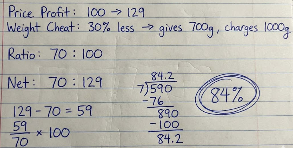 If a trader claims profit = (p%) and gives (x%) less weight, then