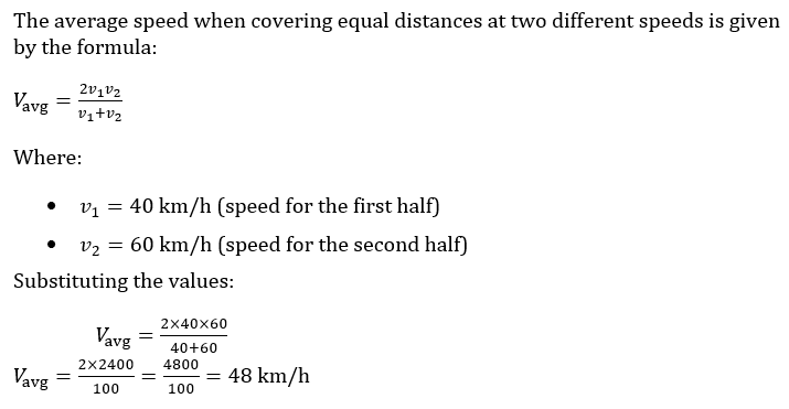 A train comes first half of the distance between two places at a speed of 40 km/hr and the second half at 60 km/hr. what is an average speed of the train?