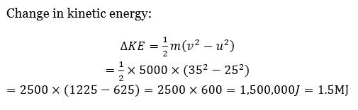 A truck of mass 5000 kg accelerates from 25 m/s to 35 m/s. Find the change in its kinetic energy (in MJ).