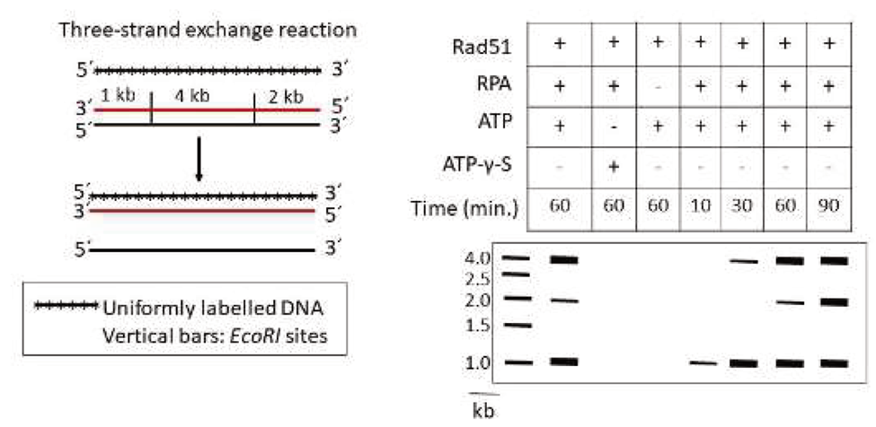 The experiment analyzes the three-strand exchange reaction and the role of Rad51 and RPA proteins, along with ATP or ATP-γS, in the strand-exchange mechanism. The reactions were terminated at various time points, and EcoRI was used to digest the DNA. The resulting DNA fragments were analyzed using electrophoresis and autoradiography.