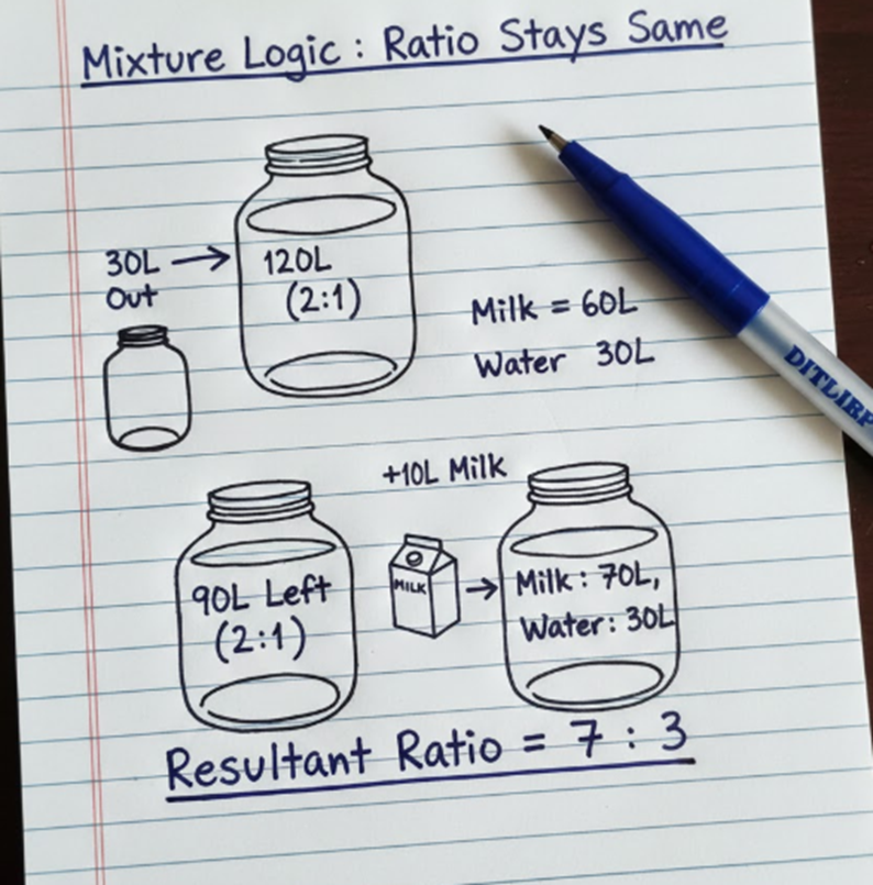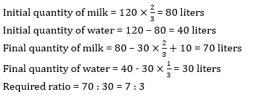 A vessel contains 120 liters mixture of milk and water in the ratio of 2 : 1. 30 liters mixture is taken out from the vessel and 10 liters pure milk added in the remaining mixture. Find the ratio of milk to water in resultant mixture?