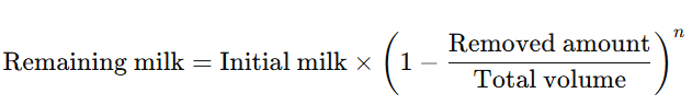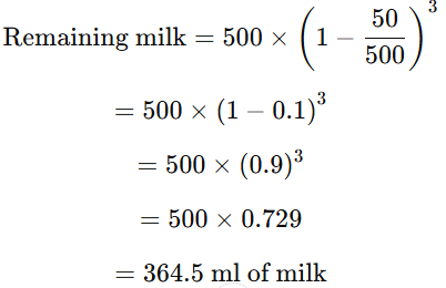 Each time we remove 50 ml of milk and replace it with water, the remaining milk follows an exponential decay pattern: