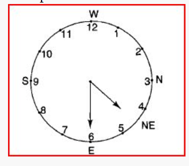 · From the diagram at 4:30 ,The hour hand is 45 degrees behind minute hand ,so moving 45 degrees anticlockwise from east we are moving in NE direction