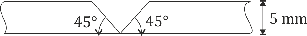 Given:∙ Cross-section: Right triangle with 5 mm height and 45∘ angles∙ Voltage V=24V∙ Welding speed v=12mm/s∙ Efficiency η=80%=0.8∙ Specific energy to melt steel=8J/mm3