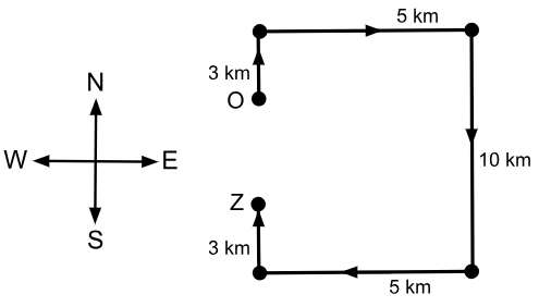 - Aakash starts from Point O and drives 3 km towards the north.