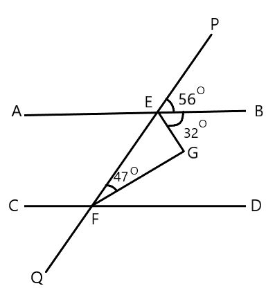 Transversal PQ intersects AB and CD at E and F respectively.