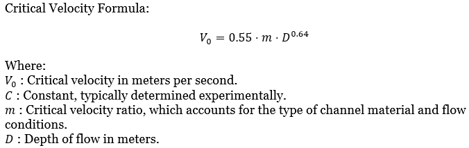 According to Kennedy, the critical velocity in meters in a channel is the mean velocity which keeps the channel free from silting or scouring. Its val