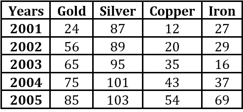 The table provides the production data (in thousand tonnes) for four elements: Gold, Silver, Copper, and Iron, from the year 2001 to 2005.