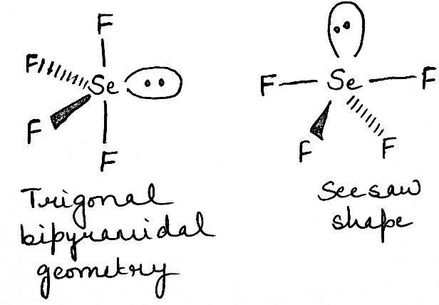 The seesaw molecular shape is found in selenium tetrafluoride ( SeF4). The name "seesaw" comes from the observation that it looks like a playground seesaw. The seesaw shape occurs when a molecule has a steric number of 5, with the central atom being bonded to 4 other atoms and 1 lone pair. An equatorial lone pair is repelled by only two bonding pairs at 90°, whereas a hypothetical axial lone pair would be repelled by three bonding pairs at 90° which would make the molecule unstable. Repulsion by bonding pairs at 120° is much smaller and less important.