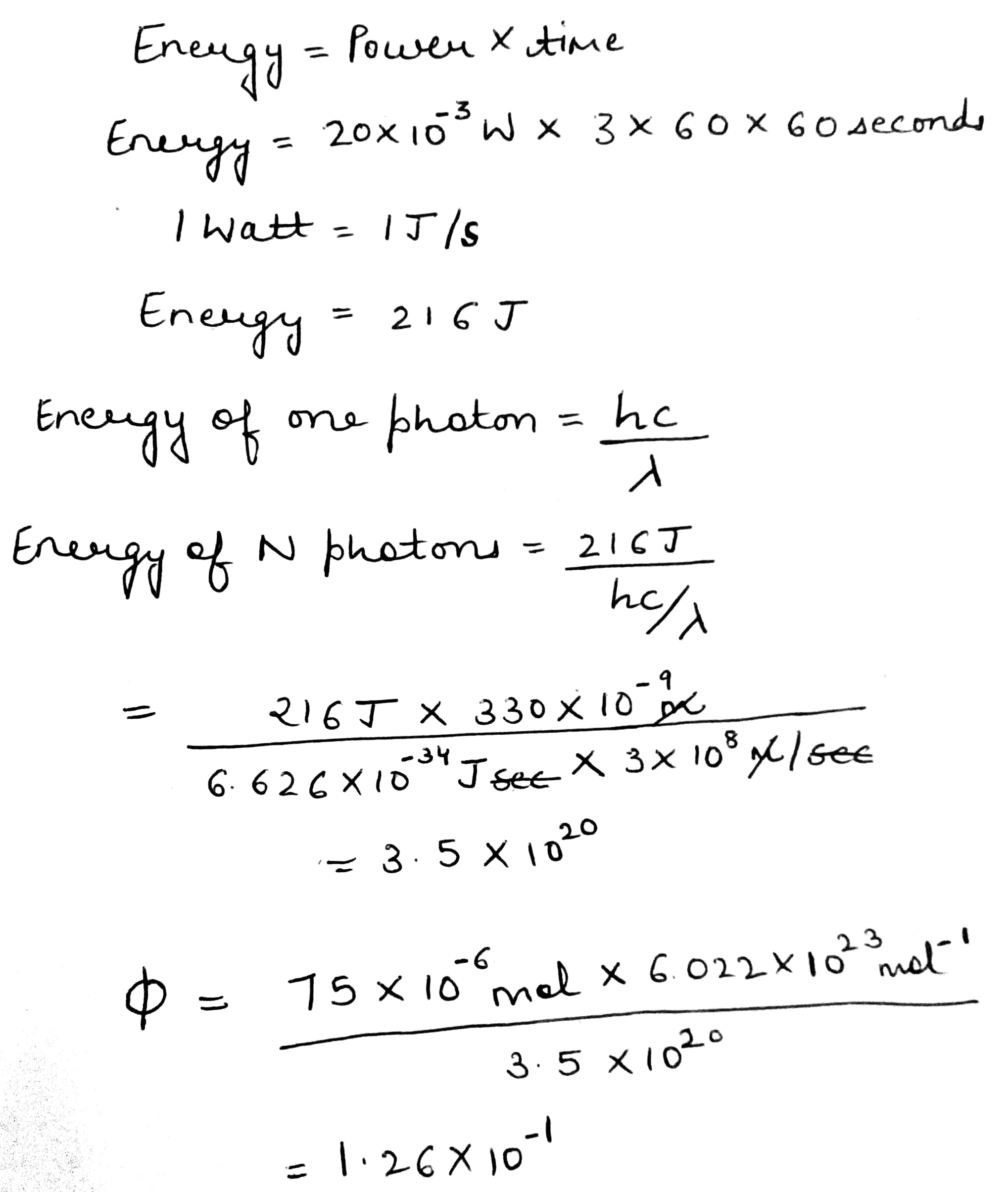 Acetone undergoes photodissociation upon absorption of 330nm light. Exposure of a gaseous sample of acetone to a radiant power of 20mW at 330nm for a period of 3 hours results in the photodissociation of 75 µmol of acetone. The quantum yield for the photodissociation, assuming all the light is absorbed, is