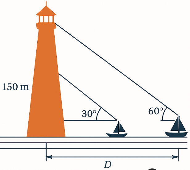 Aditya is standing on a light house of 150 m height and watching two boats on either side with angles of depression of 30o and 60o, respectively. Find