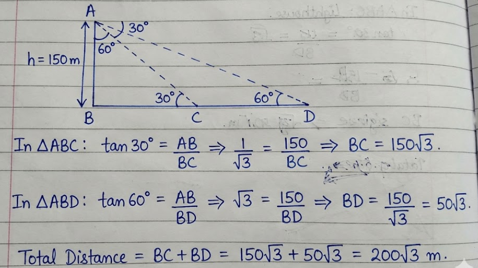 Aditya is standing on a light house of 150 m height and watching two boats on either side with angles of depression of 30o and 60o, respectively. Find the distance between the two boats.