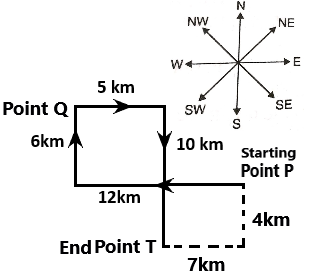 7km towards east and 4km left towards north will take him to point P from point T.