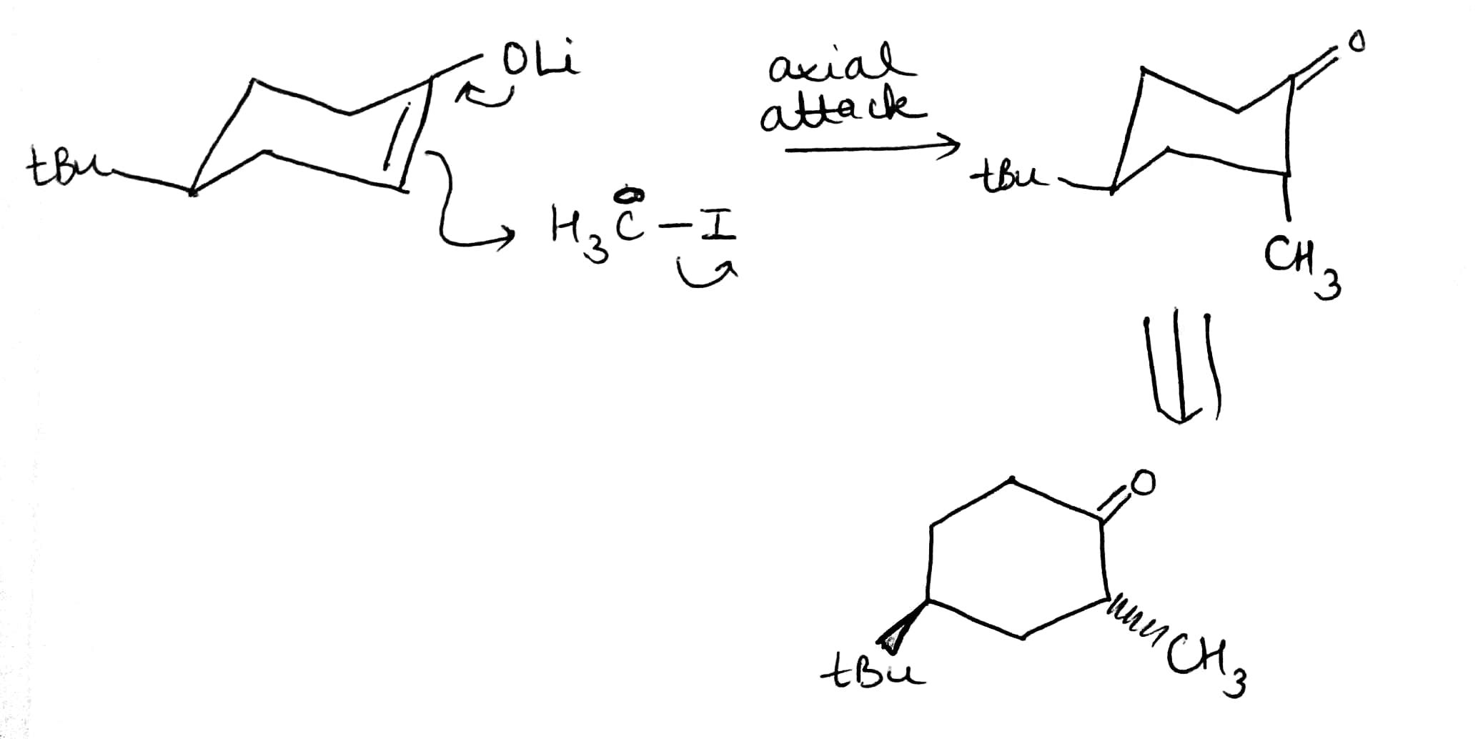 Attack from the apparently more hindered bottom face makes the trigonal carbon atom turn tetrahedral in the opposite sense by forming a vertical bond to the electrophile downwards. The ring goes directly to a chair form with the electrophile in the axial position.