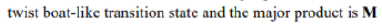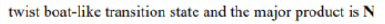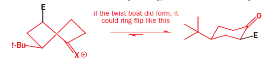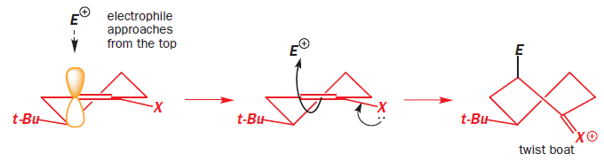 As the electrophile bonds to the trigonal carbon atom, that atom must become tetrahedral and it does so by forming a vertical bond upwards. The result is shown in the diagram—the ring turns into a twist-boat conformation. Now, of course, after the reaction is over, the ring can flip into a chair conformation and the new substituent will then be equatorial, but that information is not present in the transition state for the reaction. We could say that, at the time of reaction, the molecule doesn’t ‘know’ it can later be better off and get the substituent equatorial: all it sees is the formation of an unstable twist boat with a high-energy transition state leading to it.