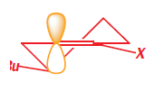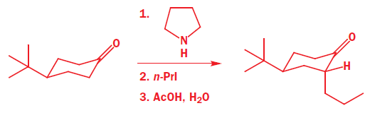 It is a simple matter to show that the preferred product has the new propyl group in the axial position because both the starting ketone and the product have chair conformations with the t-butyl equatorial. To get at the explanation we need to look at the conformation of the enamine intermediate. At this point we shall generalize a bit more and write a structure that represents any enol derivative where X may be OH, O- , OSiMe3 , NR2 , and so on. The conformation has a double bond in the ring, and is a partially flattened chair.