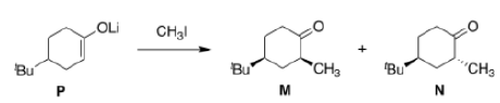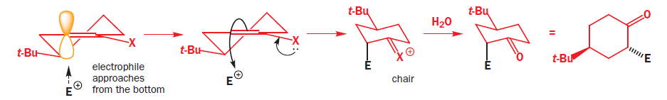 The t-butyl group is in an equatorial position at the back of the ring. The electrophile must approach the enol derivative from more or less directly above or below because only then can it attack one of the lobes of the p orbital at the enol position shown in yellow. The top of the molecule looks to be more open to attack so we shall try that approach first.