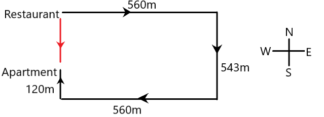 ​Amit told Shweta “To reach our apartment. your mother must walk 560m towards the east from her restaurant. She must then take a right turn and walk 543m. She must take another right turn and walk 560 to. Then she must take one final right turn and walk 120m”. How far and in which direction is the apartment from the restaurant? (All turns are 90 degree turns only)​