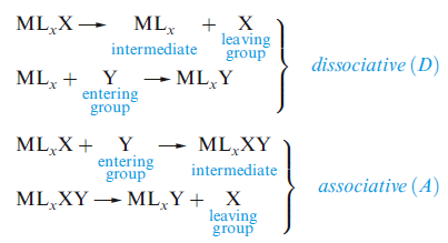 In inorganic substitutions, the limiting mechanisms are dissociative (D), in which the intermediate has a lower coordination number than the starting complex, and associative (A), in which the intermediate has a higher coordination number.