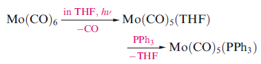 The substitution of a CO ligand by another 2-electron donor (e.g. PR3) may occur by photochemical or thermal activation, either by direct reaction of the metal carbonyl and incoming ligand, or by first replacing a CO by a more labile ligand such as THF or MeCN.