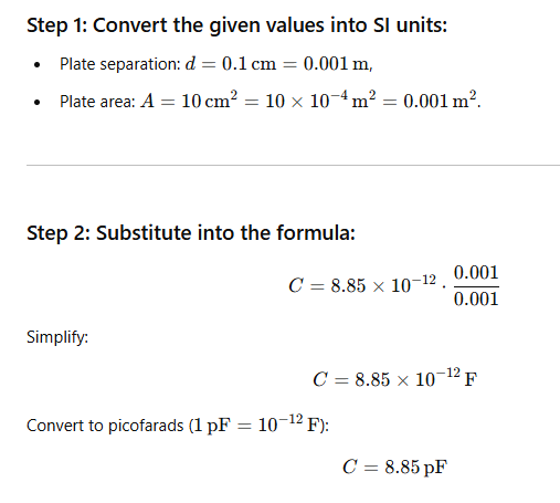 An air capacitor has its plates separated by a 0.1 cm distance. The total area of the plates is 10 cm². Identify the value of capacitor from the options given below?
