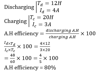 An alkaline cell is discharged at a steady current of 4 A for 12 hours. To restore it to its original state of charge, a steady current of 3A for 20 hours is required. Calculate Ah efficiency.