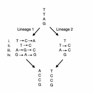 iii. A → G → C in Lineage 1 and A → C in Lineage 2:
