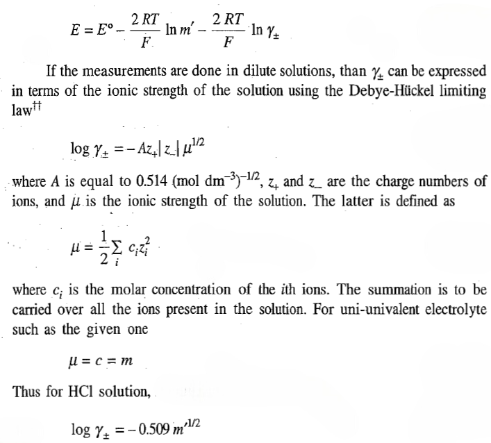 The standard half-cell potentials are employed for calculating accurate values of various quantities such as equilibrium constant of a weak acid and ionic product of water. It is, therefore, essential to know their accurate values. For this purpose, the method of extrapolation is employed. To illustrate the method, we consider the following cell.
