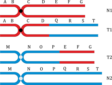 N1 + T2 or T1 + N2 go to one pole. Each gamete gets duplicated and deficient regions. This produces non-viable or inviable gametes.