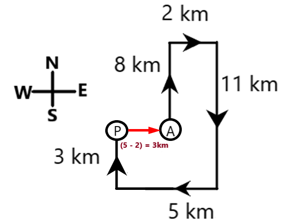 Anil starts from point A and drives 8 km towards North. He then takes a right turn, drives 2 km, turns right and drives 11 km. He then takes a right turn and drives 5 km. He takes a final right turn, drives 3 km and stops at point P. How far (shortest distance) and towards which direction should he drive in order to reach point A again? (All turns are 90 degrees turns only unless specified.)