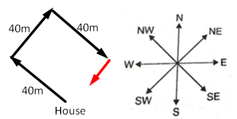 He again turns and walks 40 metres in south-east and finally he turns again towards his house.