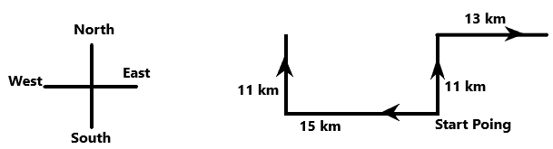Gautam starts from Point A and drives 9 km towards south. He then takes a right turn, drives 4 km, turns right and drives 11 km. He then takes a right turn and drives 6 km. He takes a final right turn, drives 2 km and stops at Point P. How far (shortest distance) and towards which direction should he drive in order to reach Point A again? (All turns are 90° turns only unless specified.)