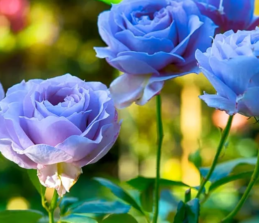 This rose is not truly blue, but has a lavender to purplish-blue hue due to the combination of existing pigments in roses.