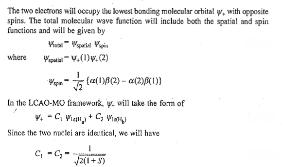 The two electrons will occupy the lowest bonding molecular orbital ψ+ with opposite spins. The total molecular wave function will include both the spatial and spin functions and will be given by